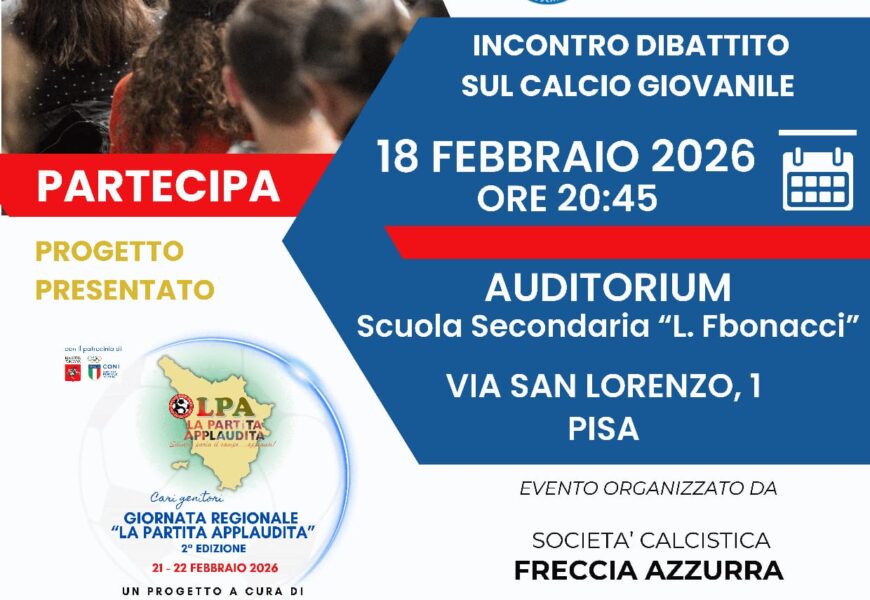 Nell’edizione 2025/2026 saranno circa 130 le gare disputate in modalità LPA – La Partita Applaudita – su tutto il territorio regionale, con l’obiettivo di consolidare una cultura sportiva fondata sul rispetto dei ruoli: l’allenatore allena, il capitano dialoga con l’arbitro, i genitori sostengono. Inoltre, la seconda edizione coinvolgerà anche parte dell’Emilia Romagna e dell’Umbria. In vista della giornata regionale, mercoledì 18 febbraio 2026 alle ore 20.45, organizzato dalla Asd Freccia Azzurra (il cui direttore sportivo, Massimiliano Romano, è socio fondatore dell’Associazione Calcio Fair Play) e patrocinato da Comune di Pisa e dalla Provincia di Pisa, presso l’Auditorium della Scuola Secondaria “L. Fibonacci” di Pisa, si terrà un incontro informativo rivolto alle società sportive del territorio. All’appuntamento parteciperanno l’assessore Frida Scarpa, il presidente della Provincia Massimiliano Angori e il presidente del Comitato Regionale Toscano LND Paolo Mangini. L’incontro sarà l’occasione per illustrare nel dettaglio le finalità educative dell’iniziativa e il protocollo di svolgimento della giornata, oltre a rafforzare il coinvolgimento diretto di dirigenti, tecnici, atleti e famiglie, considerato elemento fondamentale per il successo del progetto.
