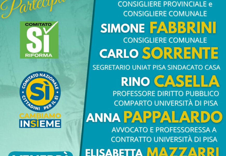 ASCIANO PISANO – Si terrà venerdì 20 marzo alle ore 21, presso il Circolo CSI in via Barachini 3, un incontro pubblico dedicato al tema del referendum sulla giustizia, promosso dal Comitato “SI – Cambiamo insieme.