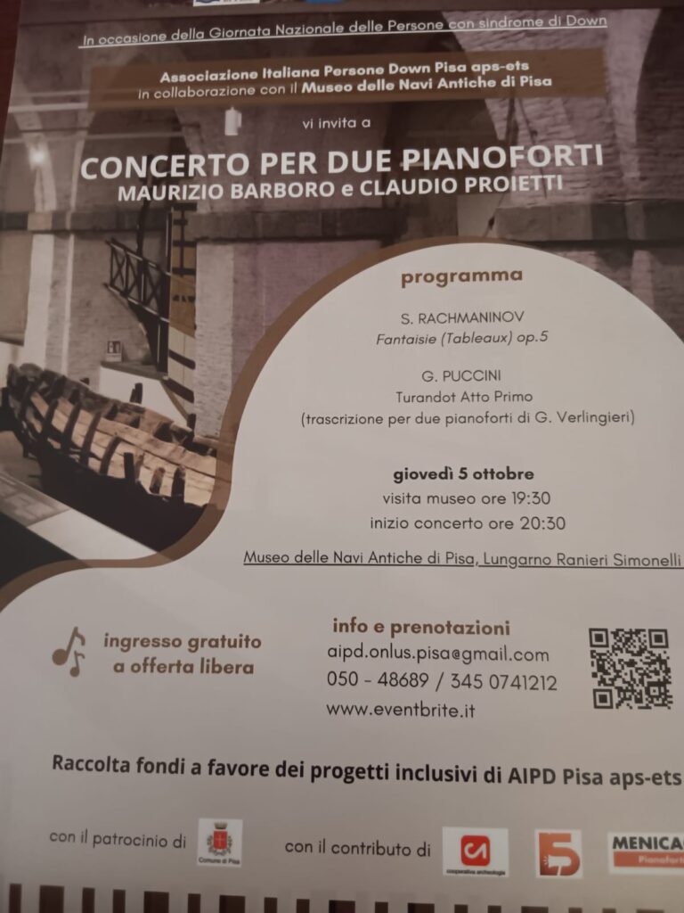 PISA – In occasione della Giornata Nazionale delle Persone con sindrome di Down, AIPD Pisa aps-ets (Associazione Italiana Persone Down Pisa), in collaborazione con il Comune di Pisa, il Museo delle Navi Antiche di Pisa e Rotary Club di Pisa, organizza un evento dedicato alla musica, alla socialità e alla beneficenza.