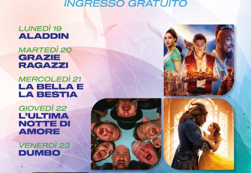 Primo appuntamento sarà il film “Aladdin”, lunedì, per poi proseguire martedì 20 con “Grazie ragazzi”, mercoledì 21 con “La bella e la bestia”, giovedì 22con “L’ultima notte di amore” e venerdì 23 con “Dumbo”. Gli spettacoli si terranno dalle ore 21:30con ingresso gratuito.