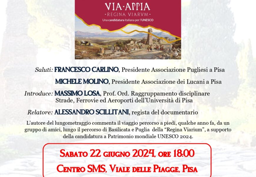 PISA – Sabato 22 giugno alle ore 18 presso il Centro SMS sul viale delle Piagge a Pisa, sarà proiettato il documentario “IL CAMMINO DELL’APPIA ANTICA”.