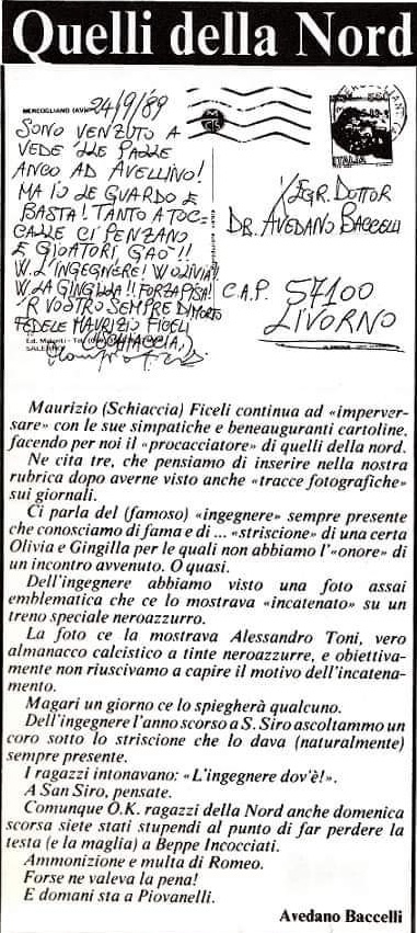 PISA – Oggi sui social, il nostro collaboratore Maurizio Ficeli, da tutti conosciuto col soprannome di “Schiaccia” “ha postato una immagine che raffigura una cartolina che lui scrisse dalla trasferta di Avellino nel 1989 con destinatario Avedano Baccelli, collaboratore del Nerazzurro, dove descriveva personaggi del tifo pisano come il famoso” Ingegnere “oppure la” Gingilla”od “Olivia”.