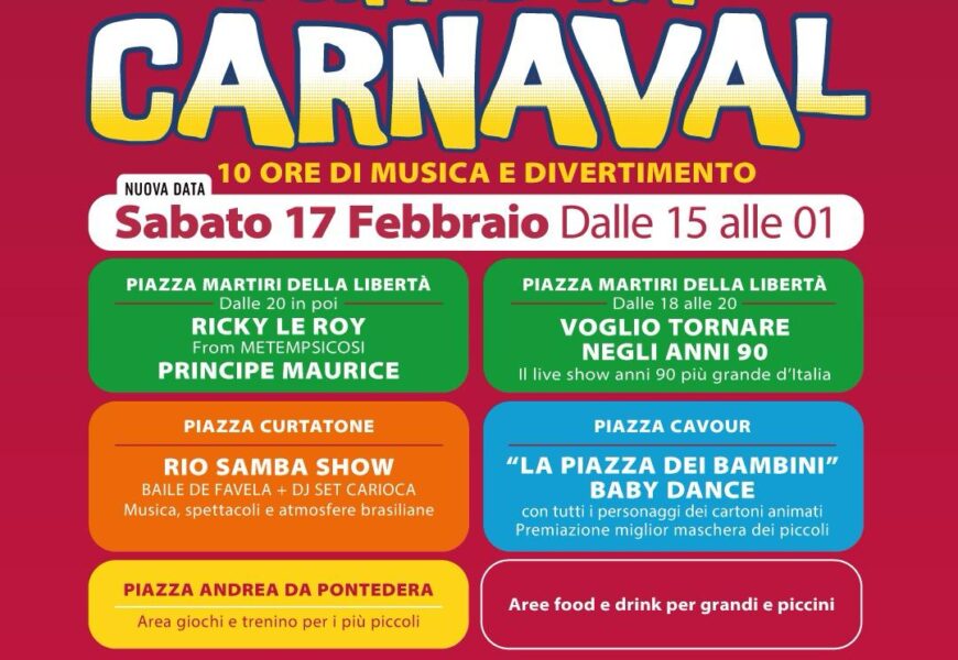 PONTEDERA – Il conto alla rovescia per il Pontedera Carnaval è iniziato, una giornata da trascorrere mascherati tra musica e divertimento. L’appuntamento è fissato per sabato 17 febbraio, dalle 15 fino alle 1. La data è stata riprogrammata dopo il rinvio dovuto al maltempo dello scorso sabato.