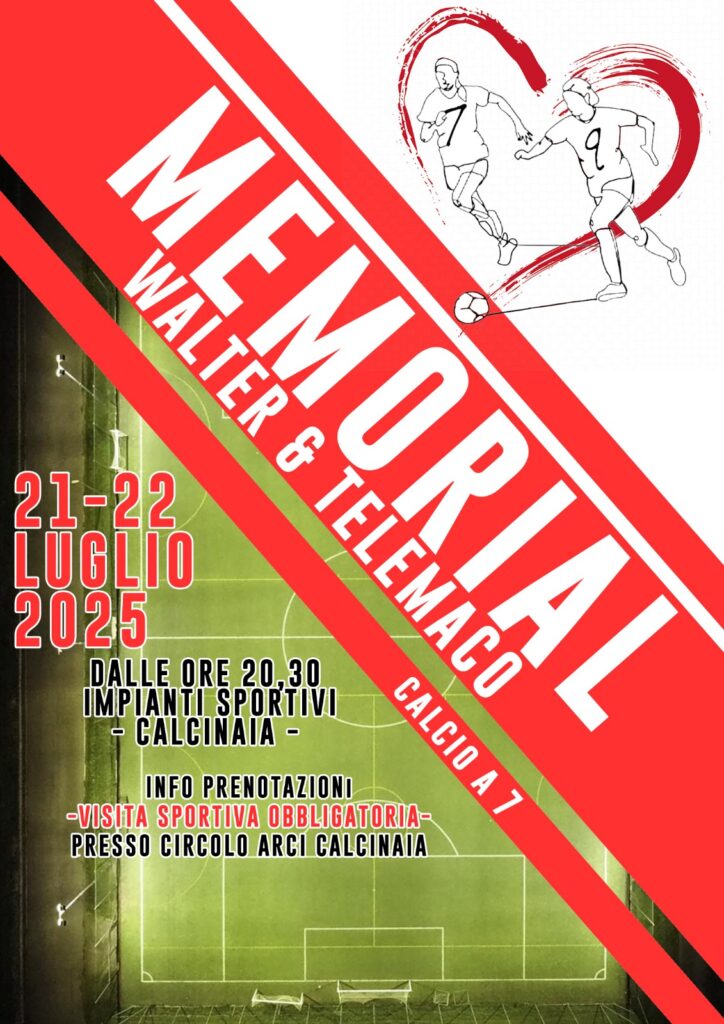 CALCINAIA – Calcinaia si appresta a vivere due intense serate all’insegna dello sport, dell’amicizia e del ricordo con il Memorial Walter e Telemaco, torneo di calcio a 7 in programma il 21 e 22 luglio presso gli impianti sportivi di via S. Ubaldesca.