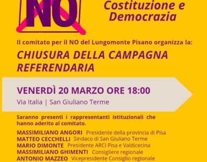 SAN GIULIANO TERME – Il comitato per il NO del Lungomonte Pisano organizza la chiusura della campagna referendaria, venerdì 20 marzo...