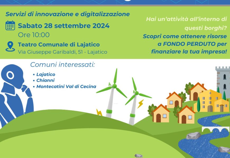 PISACNA Pisa organizza un incontro informativo gratuito il 28 settembre alle 10 al Teatro Comunale di Lajatico per presentare il Bando Servizi Innovativi dei Borghi, promosso dalla Regione Toscana.