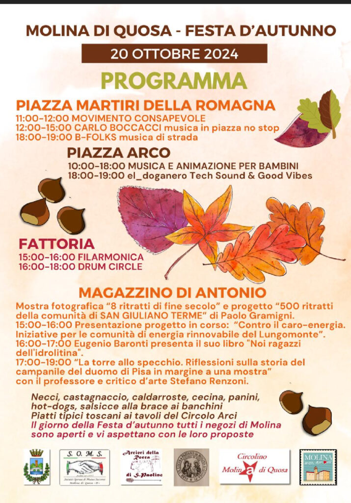 MOLINA DI QUOSA – Stand gastronomici, banchetti d’artigianato, prodotti a chilometro zero, eventi e intrattenimento per tutti. Domenica 20 ottobre 2024, a Molina di Quosa, torna la Festa d’Autunno: un appuntamento di grande richiamo per tutto il pisano, ricco di tradizione, che si svolgerà nel cuore della frazione del lungomonte sangiulianese dalle 9 alle 19.