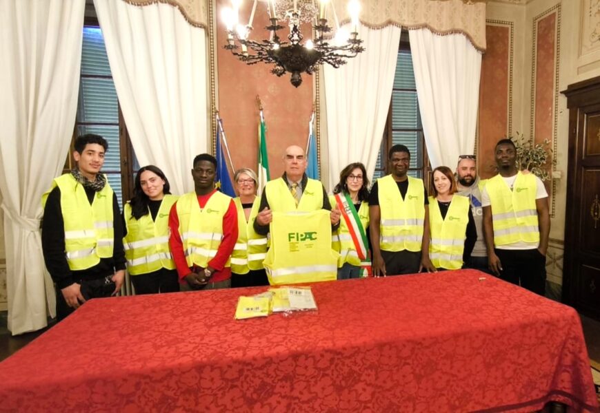 La presidente del sindacato Fipac Confesercenti Giuseppina Lotti e il consigliere Tiziano Taccola hanno consegnato le pettorine catarifrangenti alla cooperativa L’Angolo, rappresentata dalla coordinatrice del Casa di San Iacopo Elisa Battagliotti, gli assistenti sociali e alcuni ospiti della struttura che hanno portato il loro ringraziamento a nome dei migranti che vivono con loro. Il momento di scambio, alla presenza dell’assessora al sociale Candida Pugliese, si è tenuto nella Sala Niccolini situata nell’omonimo palazzo sede comunale.