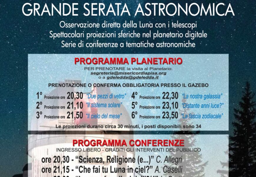 PISA – Una grande serata astronomica nelle sede della Misericordia in Via Gentile da Fabriano nel quartiere Cep a Pisa organizzata dalla Venerabile e Arcivonfraternita Di Misericordia e Crocione di Pisa, con l’osservazione diretta della luna con i telescopi. La manifestazione ha ottenuto il patrocinio del Comune di Pisa e dell’Associazione culturale sarda Grazia Deledda.