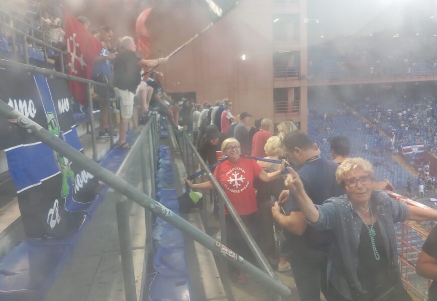 Inizia la contesa ed il Pisa si porta in avanti, sorretto dal sostegno continuo dei tifosi nerazzurri, ma poi anche la Sampdoria conquista qualche buon pallone, ma la difesa nerazzurra regge bene. Si eleva all’interno dello stadio genovese il grido poderoso “PISA, PISA!!” i Doriani rispondono con offese, ma i pisani non se ne stanno a guardare e replicano per le rime. Ed al 13’ esplodono di gioia perché i nerazzurri sbloccano il risultato con Matteo Tramoni, che elude un difensore, si trova tutto solo davanti al portiere blucerchiato, tira indovinando l’angolo alla sua sinistra per il vantaggio di uno a zero. E la rumba del tifo nerazzurro continua “Ale, alè, ale, nerazzurro è il colore che portiamo dentro al cuore”. Pisa regge ed al 41’ sfiora addirittura il raddoppio con Arena, con Stankovic che si riscatta dopo l’errore sul primo gol. 3′ di recupero ed il triplice fischio da parte dell’arbitro Camplone di Pescara, con la squadra di Aquilani che viene accompagnata negli spogliatoi dai cori di ovazione del “Popolone nerazzurro, presente. Inizia la ripresa ed il Pisa non demorde. Entra Valoti, neo acquisto al posto di Moreo che esce per infortunio, facendo vedere subito di che pasta è fatto, nonostante la posizione non sua da falso nueve e conquistando un corner.