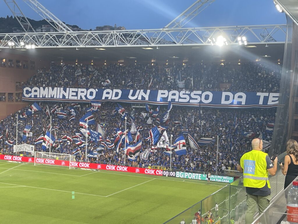 Bello il colpo d’occhio dello stadio, in tutto 22.000 presenze. La tifoseria di casa, dopo essersela vista brutta, con la nuova proprietà, ha preso entusiasmo e c’è da capirli. Tifo in fibrillazione da ambo le parti già prima di inizio gara con schermaglie verbali fra le due tifoserie, cosa ampiamente preventivata per i motivi detti ad inizio articolo . “Siamo qui per te, devi vincere” inizia il refrain dei tifosi nerazzurri, mentre i tifosi della gradinata sud rotolano uno striscione con scritto “CAMMINERO’ AD UN PASSO DA TE”, mentre nella gradinata nord dove erano presenti altri gruppi blucerchiati c’era uno striscione che recitava “BERGAMO PRESENTE, ALEDORIA ALE!!”.