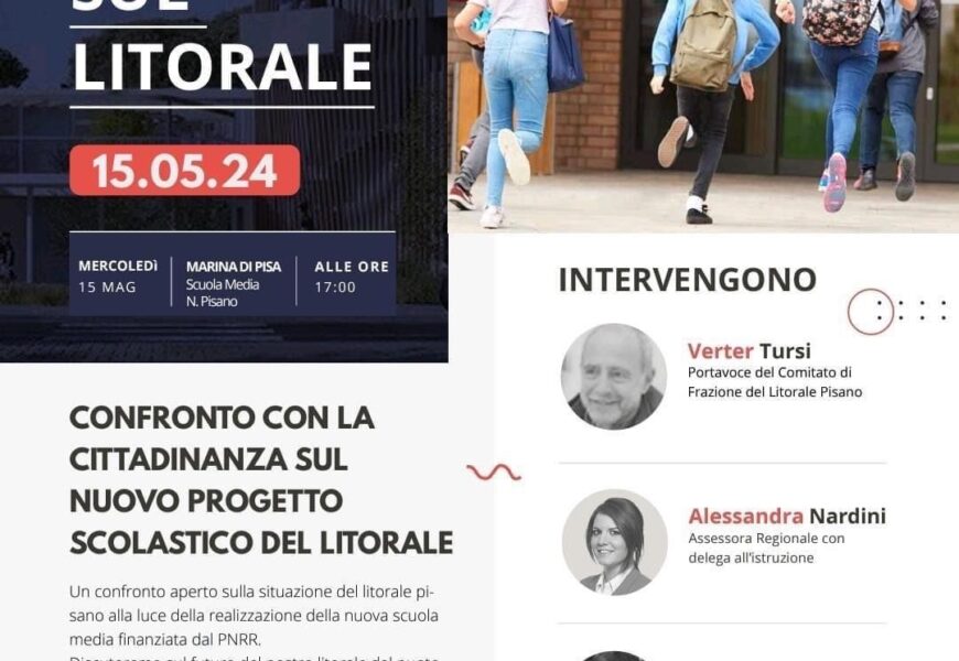 MARINA DI PISA – Un confronto aperto sulla situazione del litorale pisano alla luce della realizzazione della nuova scuola media finanziata dal PNRR si terrà mercoledì 15 Maggio alle ore 17 presso la scuola Media Niccolò Pisano a Marina di Pisa dal titolo “Il futuro della scuola sul litorale”.