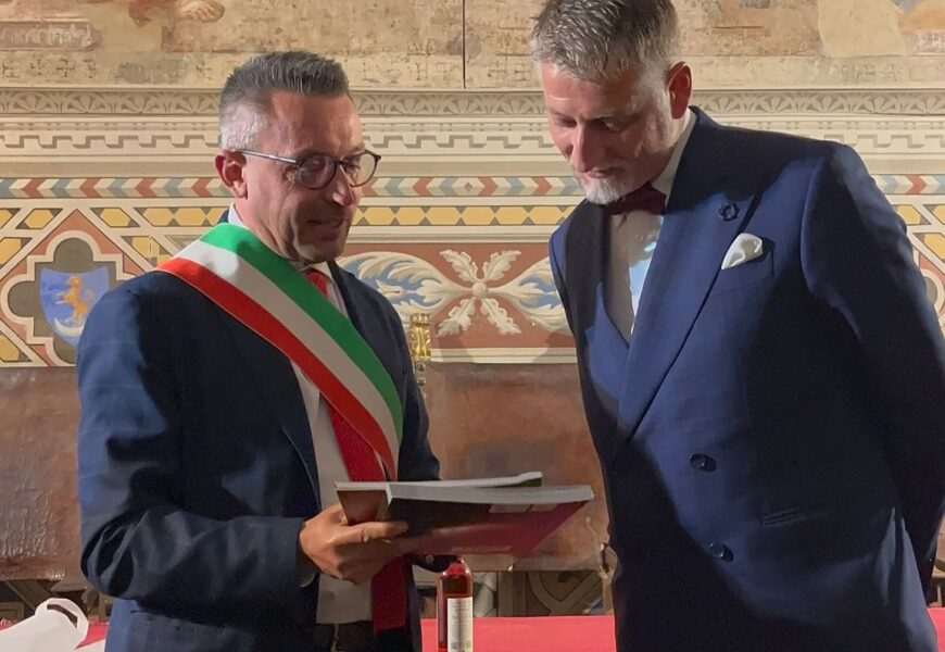 Nel corso della visita, il sindaco Arcenni ha donato al Ministro un volume sulla storia degli etruschi a Terricciola insieme a prodotti tipici locali, mentre Pedro Bessi ha consegnato alcune opere in alabastro, sottolineando la necessità di sostenere questa tradizione artigianale unica al mondo, parte integrante dell’identità culturale ed economica della città.