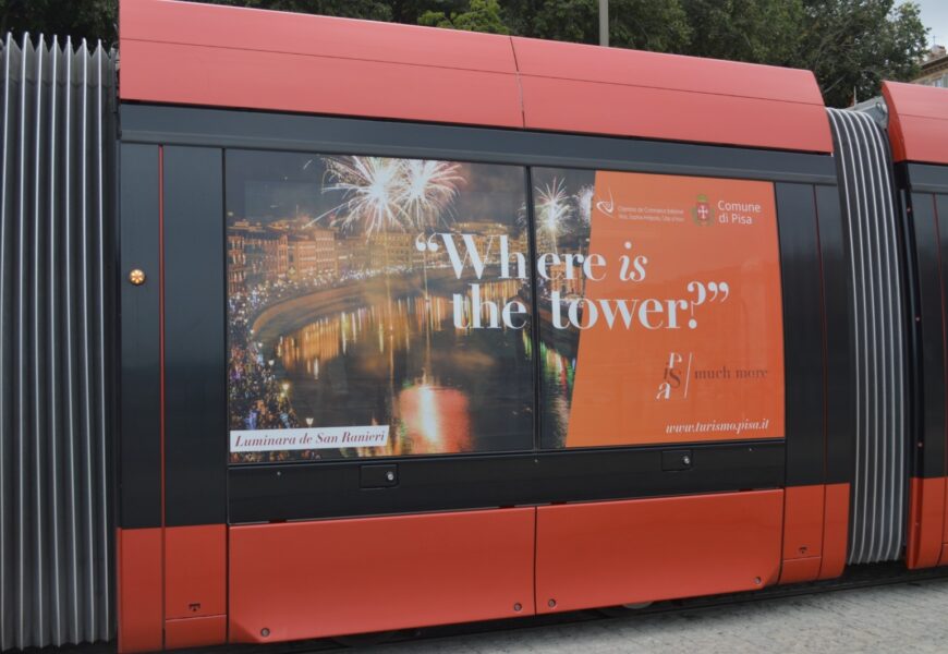 PISA – Grandi manifesti con la scritta “Where is the tower? Pisa is much more” adornano la linea principale della tramvia che collega il porto di Nizza all’aeroporto, raggiungendo così migliaia di persone ogni giorno e attirando potenziali turisti.