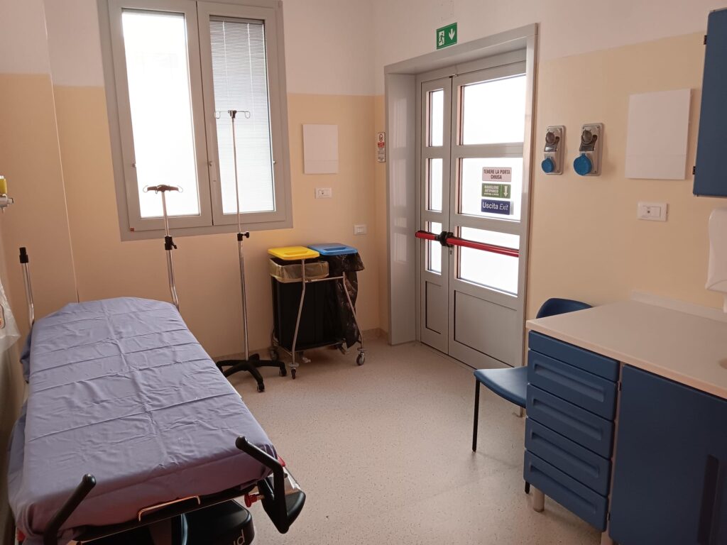 L’altro intervento è consistito nella riconversione di un reparto di degenze al piano primo dell’edificio 30 in un reparto di terapia semi-intensiva dotato di 12 posti letto. I lavori hanno riguardato la modifica distributiva degli ambienti, il rifacimento integrale degli impianti elettrico, di trasmissione dati e di trattamento aria per il controllo dei gradienti di pressione, e la nuova distribuzione dell’impianto dei gas medicinali e testa-letto. La dotazione impiantistica degli ambienti (gradienti pressori di 10 Pa, sia in depressione sia in sovra-pressione, impianti gas medicinali, 15 ricambi d’aria orari, filtri ad alta efficienza HEPA) e l’organizzazione funzionale degli spazi consentono di poter utilizzare i 12 posti letto anche come letti di terapia intensiva. In ognuna delle quattro camere (ciascuna da tre posti) gli spazi sono stati studiati in modo opportuno per consentire agevoli manovre assistenziali sui quattro lati dei letti, è presente un servizio igienico interno accessibile e l’entrata avviene tramite filtro, opportunamente pressurizzato per mantenere i diversi regimi di pressione, con dimensioni tali da consentire la vestizione del personale. In questo reparto si trasferiranno le degenze dell’Unità operativa ospedaliera di Medicina d’urgenza e pronto soccorso, finora ubicate all’Edificio 31 (sopra il Pronto soccorso).