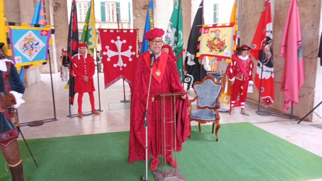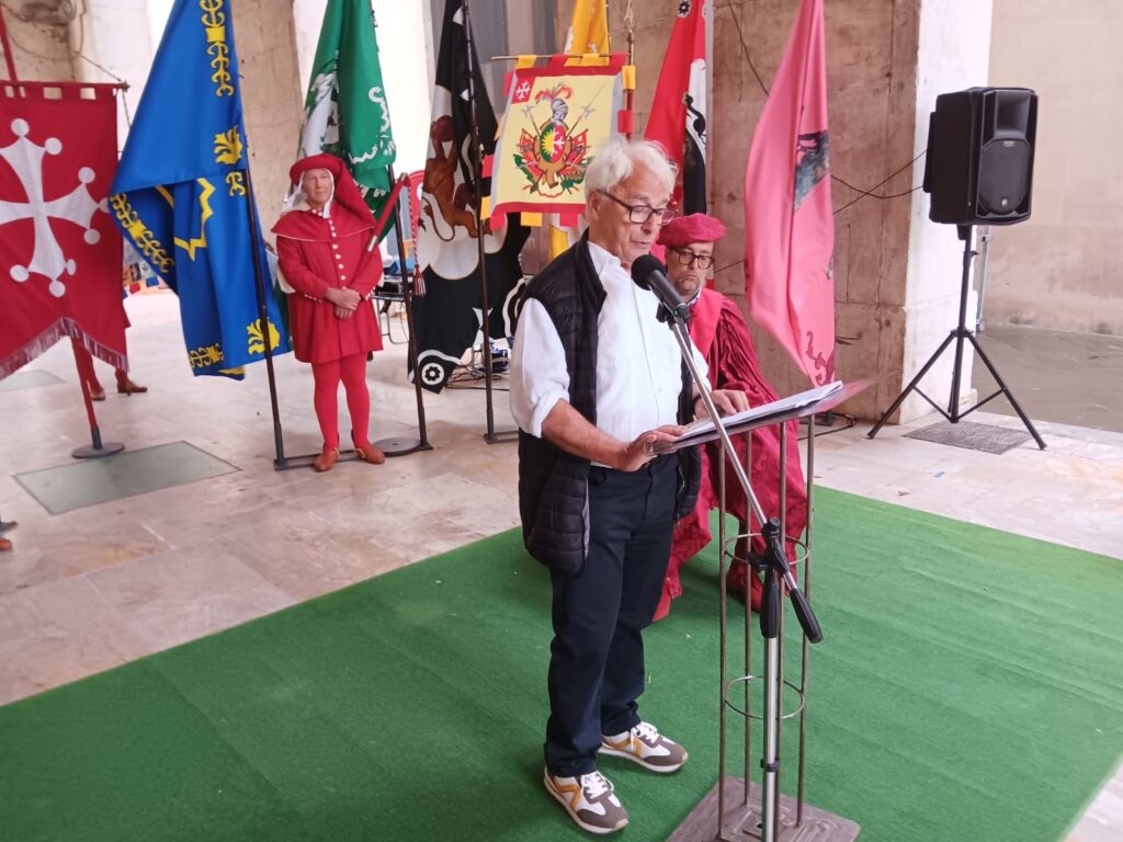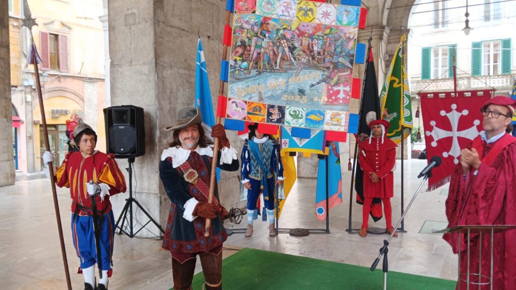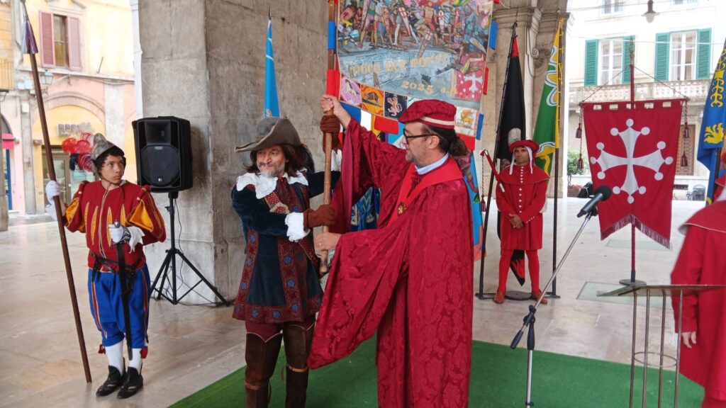 PISA – Una tradizione che si rinnova, ovvero la cerimonia di presentazione e la consegna del Palio dell’edizione 2024 del Gioco del Ponte in programma sabato prossimo 29 giugno, si è svolta al mattino di lunedì 24 giugno presso le Logge di Banchi, dove l’Assessore alle Tradizioni della Storia e dell’identità di Pisa Filippo Bediniha consegnato all’Alfiere il Palio che per quest’anno è stato disegnato dal celebre pittore Raffaele De Rosa, anch’egli presente.