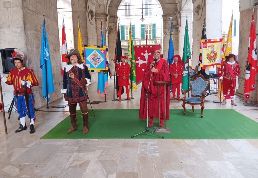 PISA – Una tradizione che si rinnova, ovvero la cerimonia di presentazione e la consegna del Palio dell’edizione 2024 del Gioco del Ponte in programma sabato prossimo 29 giugno, si è svolta al mattino di lunedì 24 giugno presso le Logge di Banchi, dove l’Assessore alle Tradizioni della Storia e dell’identità di Pisa Filippo Bediniha consegnato all’Alfiere il Palio che per quest’anno è stato disegnato dal celebre pittore Raffaele De Rosa, anch’egli presente.