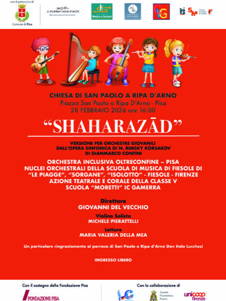PISA – Sabato 28 febbraio alle ore 16 presso la Chiesa di San Paolo a Ripa d’Arno presenta “Shaharazade” di Rimsky-Korsakov. Un evento patrocinato dal Comune di Pisa con il sostegno della Fondazione Pisa e la collaborazione della Società Filarmonica Pisana oltre che di UniCoop Firenze.