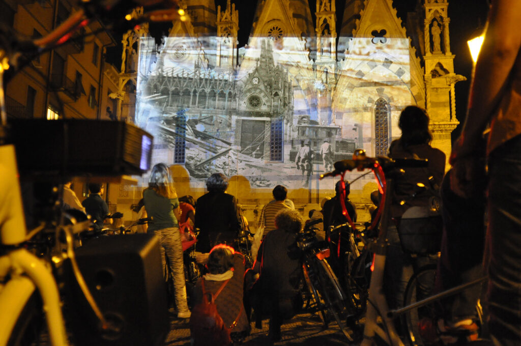 Per gli spettatori, l’esperienza è appassionante e avventurosa, con qualche incognita da affrontare: lampioni, luci, rumori, muri scuri, biciclette, motorini, passanti. L’esperimento più estremo è stato a settembre 2023, quando un pubblico di 45 persone è stato coinvolto in un’esperienza di 15 ore. Nella notte fra l’1 e il 2 settembre è stato ripercorso a piedi – nella stessa data dell’anno e alle stesse ore – il tragitto compiuto dalle truppe americane nella Liberazione di Pisa, dall’attraversamento dell’Arno, all’incontro con i partigiani sui Monti Pisani, fino all’ingresso in Piazza dei Miracoli la mattina successiva. Cinema, trekking, convivialità si sono combinati in una forma nuova di rievocazione storica. Racconta Garzella: “E’ stato come creare un film lungo 15 ore, fatto di immagini, suoni, racconti, ma anche di passi, di luoghi, di persone. Un’esperienza veramente immersiva, in cui la presenza, e la fatica del pubblico coinvolto – compresi silenzi e dialoghi – erano parte integrante del progetto”. Fra proiezioni, canti e musiche d’epoca, testimonianze, diari, archivi, musiche, suoni, i partecipanti si sono calati in una “bolla” di emozione e racconti fino all’arrivo, in mezzo ai turisti, sotto la Torre Pendente, la mattina alle 10.