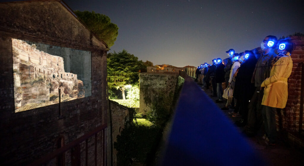 Si tratta infatti di tour, attualmente unici nel loro genere, in cui la guida è dotata di un proiettore portatile e un lettore multimediale, mentre il pubblico segue i racconti con cuffie immersive. Il risultato è un’esperienza coinvolgente, con proiezioni itineranti e racconti sonori, che combina – fra emozione e didattica – cinema, camminata e turismo culturale.