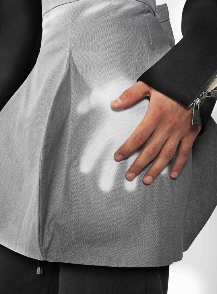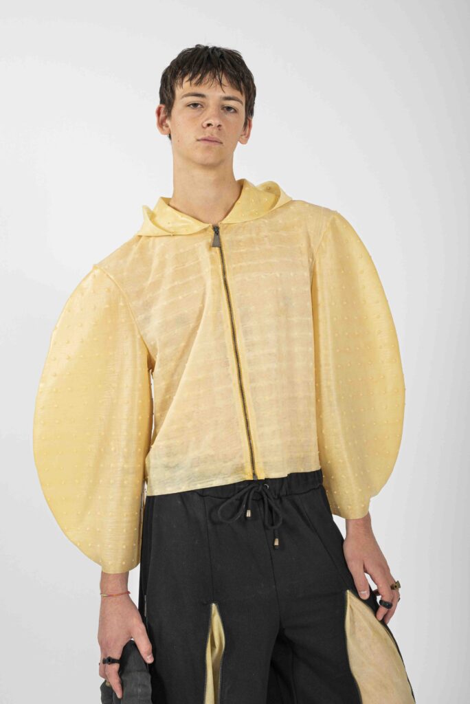 “Skin Diary” di Simone Privitelli propone invece un viaggio sensoriale tra superfici vive e materiali innovativi: latex autoprodotto dalla linfa dell’albero di Hevea, tessuti termocromatici sensibili al tocco e accessori stampati in 3D con gomma riciclata danno vita ad un racconto sul corpo e la memoria, in bilico tra natura e tecnologia, delicatezza e rigore formale.
