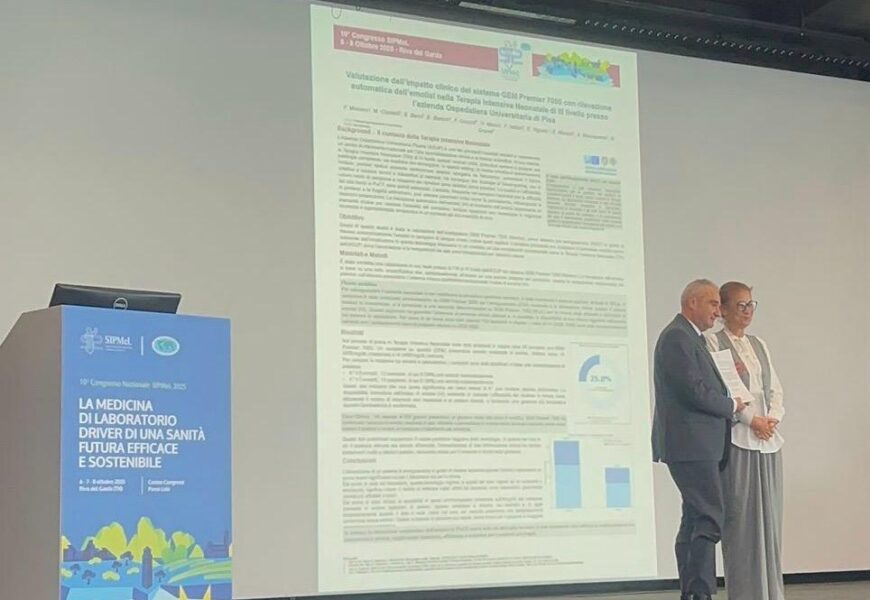 La commissione giudicatrice e la platea hanno infatti selezionato, fra i 6 premi finali del congresso, il lavoro dal titolo: “Valutazione dell’impatto clinico del gem premier 7000* con rilevazione automatica dell’emolisi nella terapia intensiva neonatale di III livello presso l’Azienda ospedaliero-universitaria di Pisa” presentato da Francesca Meiners, (Unità operativa di Diagnostica di laboratorio dell’Aoup) e realizzato insieme al team tecnico del PoCT (Point of care testing) e ai colleghi dell’Unità operativa di Neonatologia dell’Aoup.