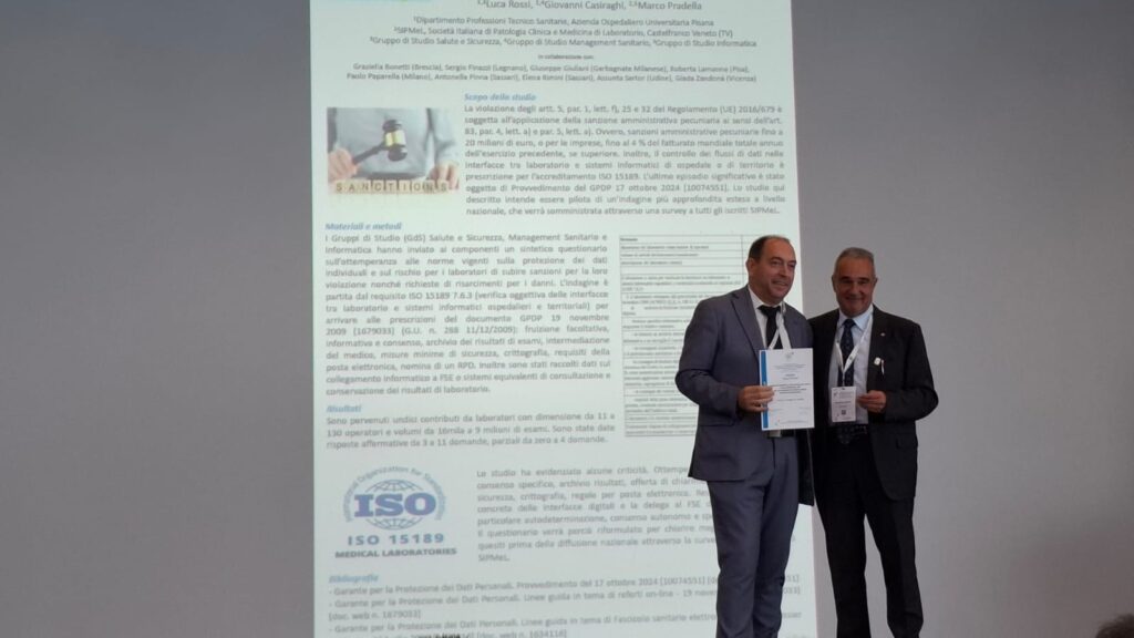 L’altro premio è stato il Poster congressuale più votato dai partecipanti al congresso, assegnato al lavoro “Rischio di sanzioni, risarcimento per danni e non conformità ISO per la consegna di risultati digitali di esami di laboratorio” presentato da Luca Rossi (Dipartimento professioni tecnico sanitarie di Aoup), realizzato dalla sinergia di 3 gruppi di studio nazionali della SipMeL (Luca Rossi è coordinatore del gruppo “Salute e Sicurezza”).