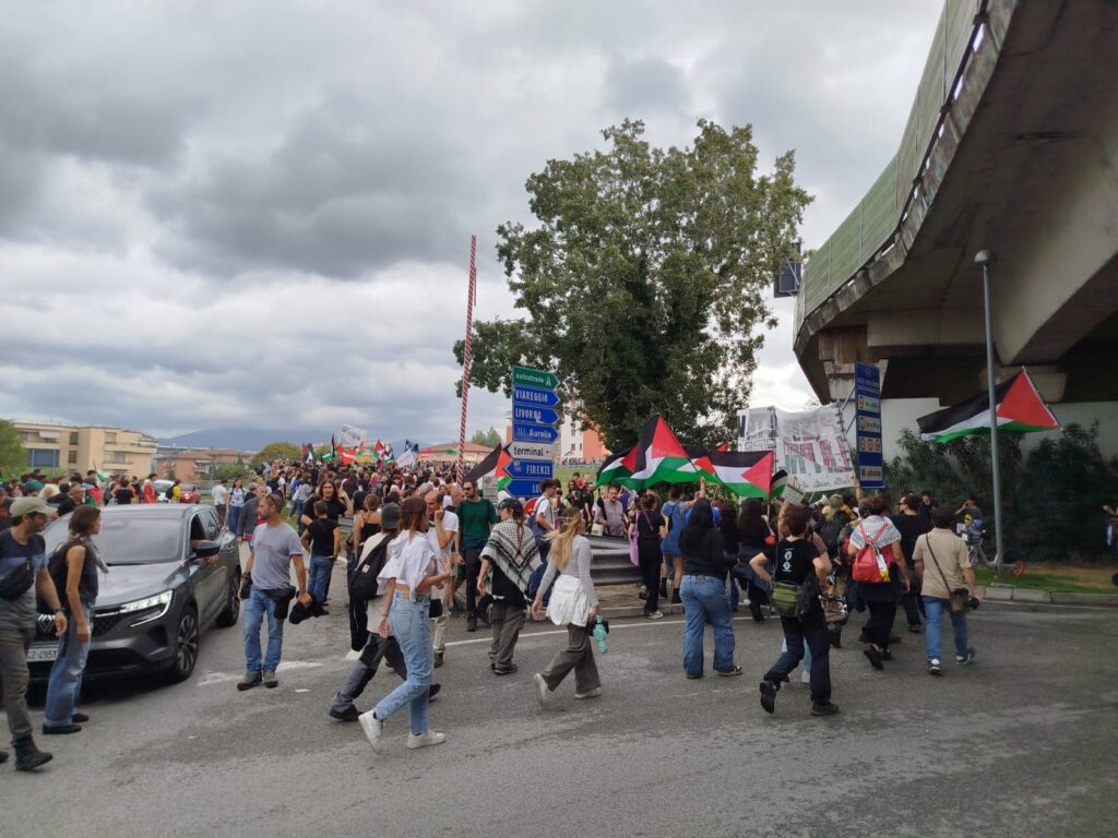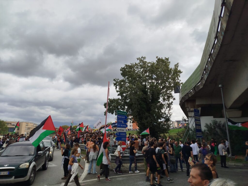 Verso le 12, la manifestazione ha preso una piega più incisiva: i partecipanti hanno raggiunto la superstrada Firenze-Pisa-Livorno, occupandola tra gli svincoli dell’aeroporto e dell’ospedale. La circolazione è rimasta bloccata per circa un’ora, con inevitabili disagi al traffico. I manifestanti hanno poi proseguito lungo la via Aurelia, concludendo la protesta in Piazza Vittorio Emanuele II.