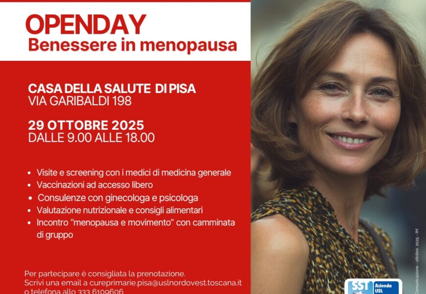 PISA Mercoledì 29 ottobre, presso la Casa della Salute di Pisa (al distretto sanitario di via Garibaldi 198), si terrà l’ Open Day dedicato alla salute della donna in menopausa.