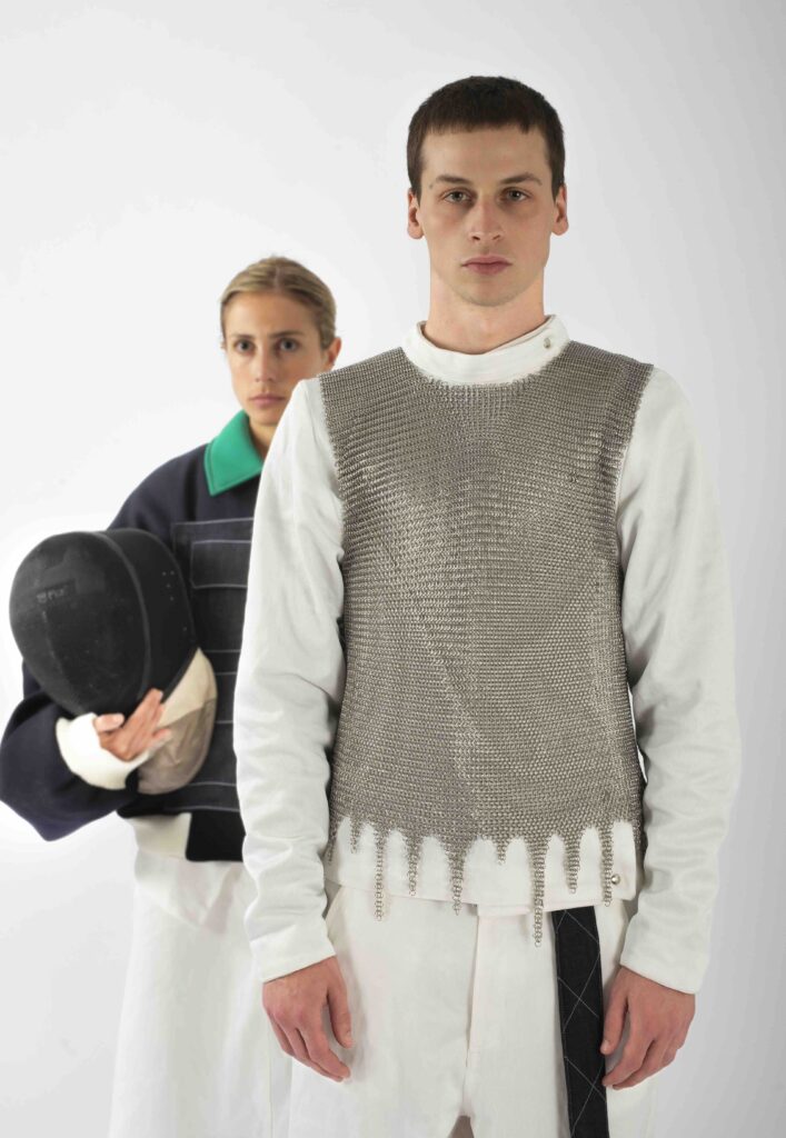 Nell’area espositiva, i visitatori potranno scoprire come la sperimentazione stia trasformando il concetto stesso di abbigliamento. È il caso di “Engarde”, una collezione nata dal corso di laurea in Fashion Design che fonde il mondo della scherma con lo streetwear, grazie all’uso del Dyneema®, la fibra più resistente al mondo, impiegata in ambito aerospaziale e balistico. Gli accessori della collezione, sviluppati con stampa 3D, completano una ricerca che intreccia performance, estetica e sostenibilità.