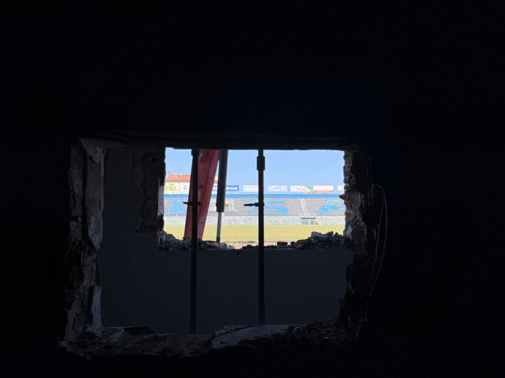 I lavori preparatori della Curva Sud sono stati completati e si è pronti per iniziare l’impermeabilizzazione, seguita dalla posa dei nuovi seggiolini che restituiranno al settore un volto del tutto rinnovato. Sotto la tribuna, concluse le demolizioni, è stato realizzato il nuovo tunnel di accesso al campo, una delle novità più rilevanti dell’intero progetto, sia per funzione che per significato. Si passerà ora alle gettate in cemento armato, fondamenta delle future strutture.