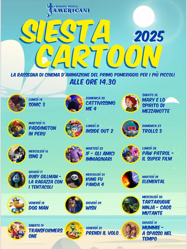 TIRRENIA – Al Bagno degli Americani di Tirrenia al via la rassegna cinematografica in riva al mare “Siesta Cartoon 2025”, appuntamento pomeridiano dedicato ai bambini in collaborazione con Cinema Arsenale e Alfea Cinematografica.