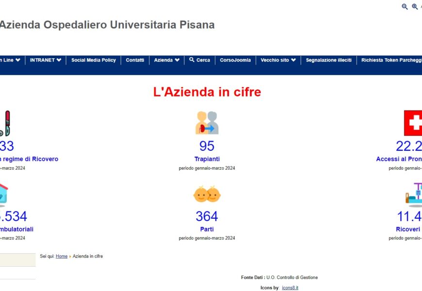 PISA – Da qualche giorno è online sul portale dell’Aoup www.ospedalepisa.it, nella banda blu del menu in alto, la voce “Azienda in cifre” da cui è possibile visualizzare i dati di attività del trimestre gennaio/marzo 2024.