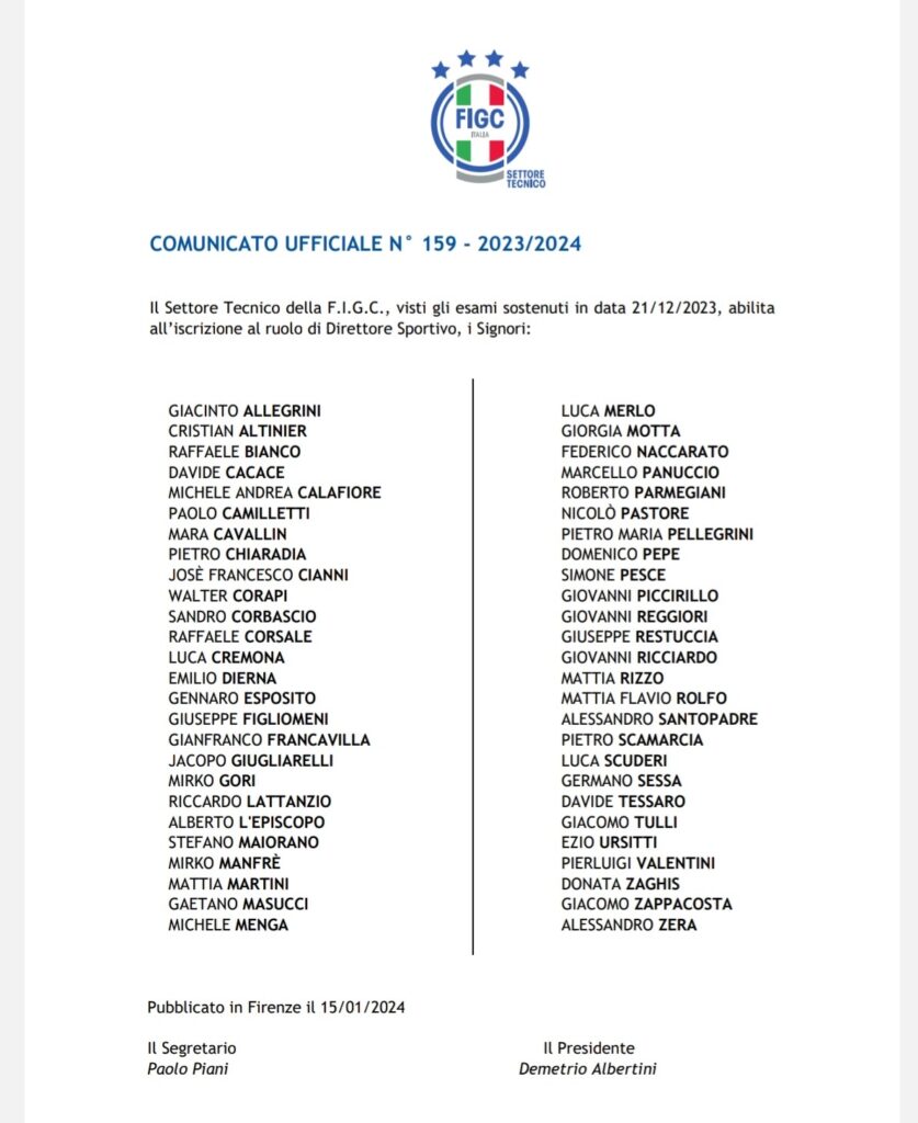 Il settore tecnico della Federazione Italiana Gioco Calcio, tramite il Comunicato Ufficiale n° 159 del 15 gennaio 2024, ha diramato l’elenco delle persone che hanno sostenuto e superato l’esame in data 21.12.2023 per l’abilitazione al ruolo di Direttore Sportivo e fra questi nomi c’è proprio anche quello del nostro Tano Masucci ed oltre a lui, anche quello di un altro ex nerazzurro, Giacomo Tulli, con cui ci complimentiamo.