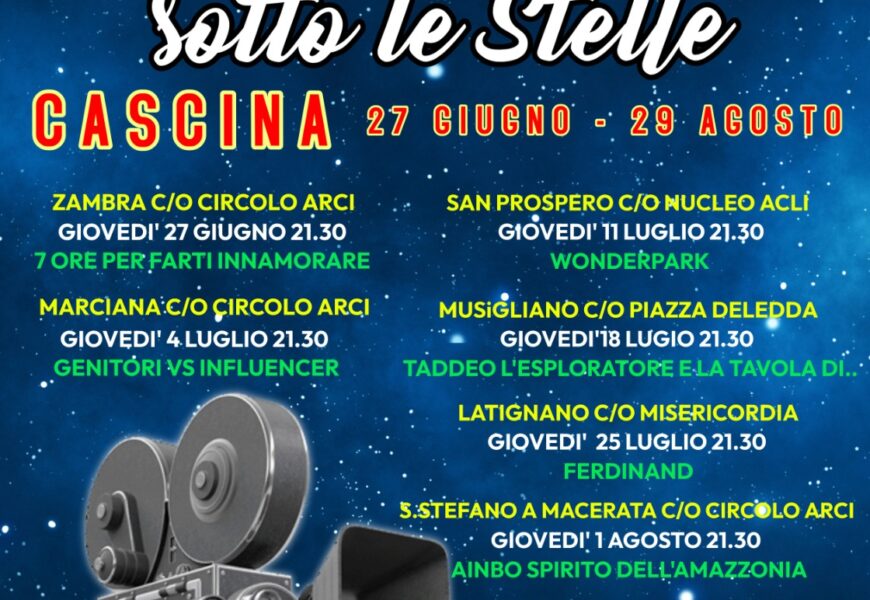 Zambra, Marciana, San Prospero, Musigliano, Latignano, Santo Stefano a Macerata, San Lorenzo alle Corti, San Casciano e Casciavola i paesi che quest’anno saranno interessati dal programma pensato per le famiglie. “Quest’anno torna il cinema all’aperto nelle frazioni – aggiunge Simone Perini della Pro Loco –. La Pro Loco si è impegnata, insieme all’amministrazione e al grande contributo di Sogefarm che ci permette di sostenere tutte le spese, per realizzare questa importante iniziativa che porta un po’ di vita nelle frazioni, con piccoli eventi pensati principalmente per le famiglie e i bambini. Invitiamo tutti i cascinesi a venire e partecipare, l’ingresso è gratuito e ci sono tutti i presupposti per passare una serata tranquilla di cinema sotto le stelle”.