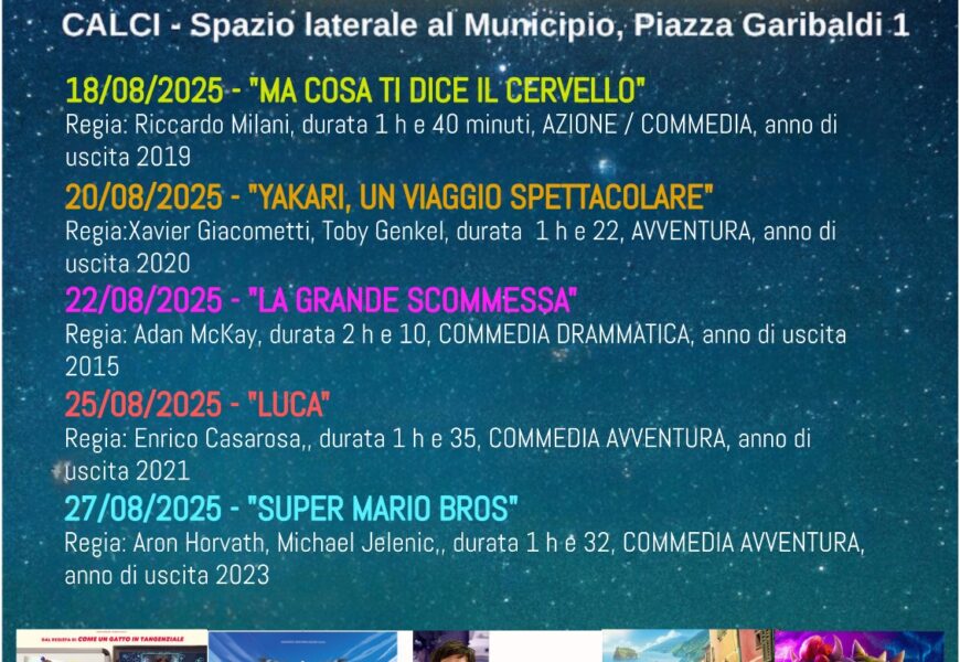 CALCI – Prosegue l’Estate in Valgraziosa con la seconda metà di agosto dedicata al “Cinema sotto le Stelle”, cinque serate di proiezioni gratuite per grandi e piccoli nello spazio accanto al palazzo comunale, in piazza Garibaldi. L’iniziativa, giunta alla quinta edizione, è promossa dal Comune di Calci in collaborazione con l’agenzia Eventi in Circolo.