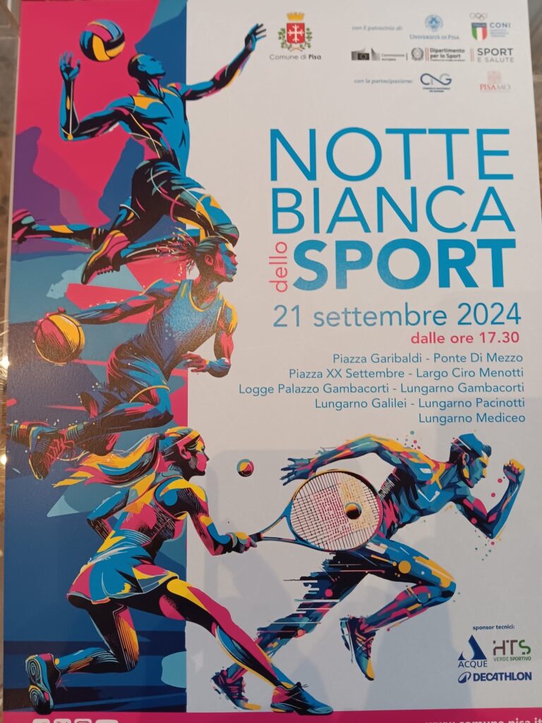 PISA – Dopo il successo ottenuto lo scorso anno, Pisa presenta sabato 21 settembre la seconda edizione de La Notte Bianca dello Sport, evento che si inserisce nell’ambito della più vasta iniziativa promossa dalla “European Sport Week” che si svolge annualmente in questo periodo a far tempo dal 2015, in contemporanea in tutti i Paesi dell’Unione Europea, ed il cui programma è stato illustrato al mattino di martedì 17 settembre presso la Sala delle Baleari di Palazzo Gambacorti, alla presenza dell’Asessore allo Sport del Comune di Pisa Frida Scarpa, del Prof. Marco Macchia, delegato per i rapporti con il Territorio dell’Università di Pisa, di Giuseppe Nunziata, Responsabile Decathlon per Pisa e di Marco Pacini, Responsabile della Società HTS Verde Sportivo.