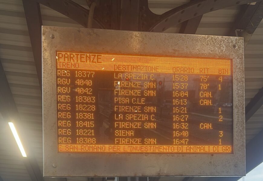 Uno di questi, diretto a Pisa, è rimasto fermo alla stazione di Empoli per più di due ore. Il suo arrivo a Pisa era inizialmente previsto per le ore 15:51, ma lo speaker della stazione ha annunciato un ulteriore ritardo.